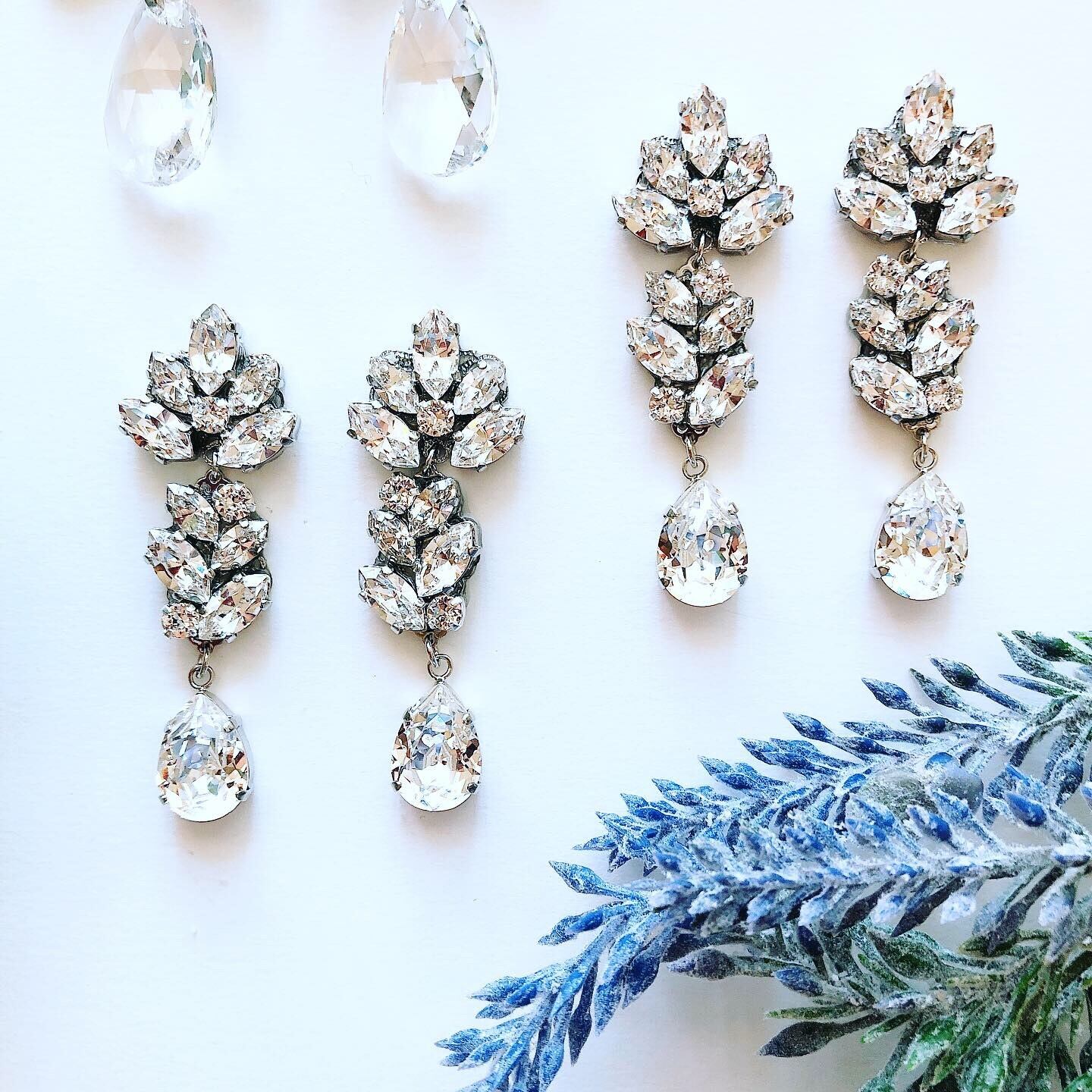 花や葉をイメージしたモチーフの下に大粒のクリスタルガラスを繋げました。