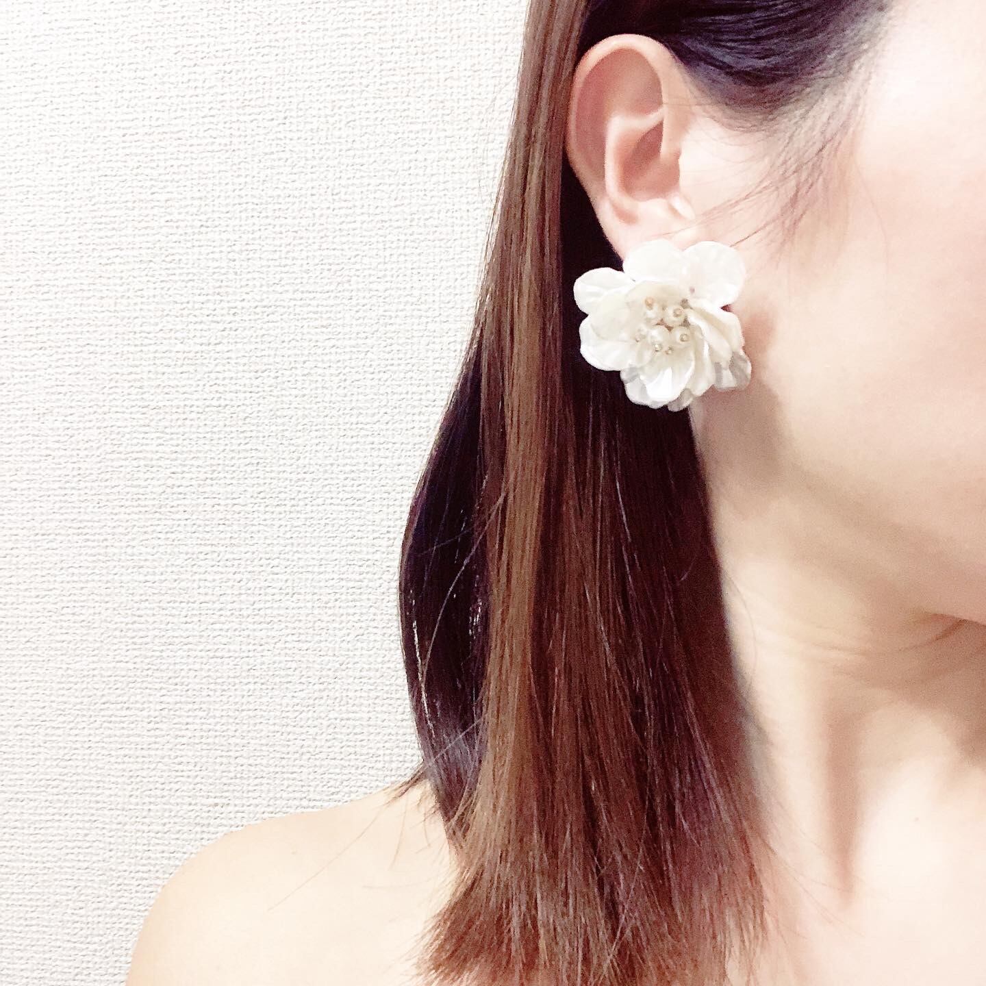 シェルのような輝きのパールビーズで作られた、ぽってりとした大きめのお花のモチーフが可愛らしいピアスです。
